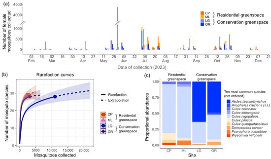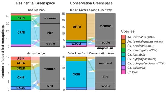 Ortiz YV, Casas SA, Tran MND, Decker EG, Saborit I, Le HN, Caragata EP, Reeves LE, Thongsripong P. Mosquito Population Dynamics and Blood Host Associations in Two Types of Urban Greenspaces in Coastal Florida. Insects. 2025; 16(3):233. https://doi.org/10.3390/insects16030233