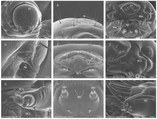 - Li, C.; Lu, Y.; Fang, H.; Jiang, L. Morphology of the third instar larva of Colobopterus quadratus (Coleoptera: Scarabaeidae: Aphodiinae) using scanning electron microscopy. Microsc. Res. Tech. 2019, 82, 1372–1379. [Google Scholar] [CrossRef]
