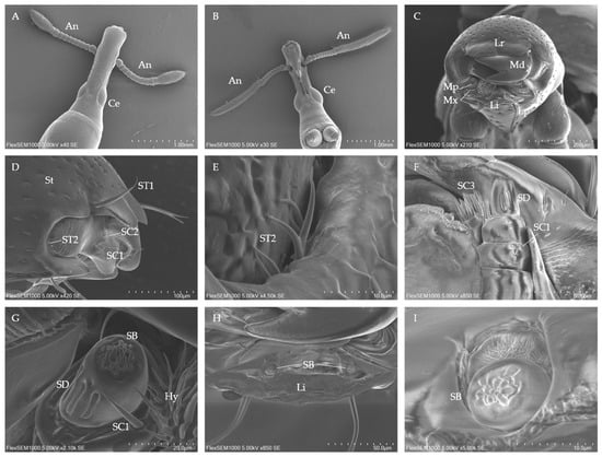 - Urcola, J.I.; Benetti, C.J.; Alarie, Y.; Rodriguez, G.; Michat, M.C. Characterization and mapping of sensilla on the head appendages of noterid larvae (Coleoptera: Noteridae), and development of a preliminary biometric method for taxa delimitation. J. Morphol. 2020, 281, 1210–1222. [Google Scholar] [CrossRef]