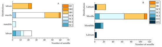 3.3. Comparison of the Distribution of Sensilla on the Mouthparts Between Larvae and Adults of C. formicarius