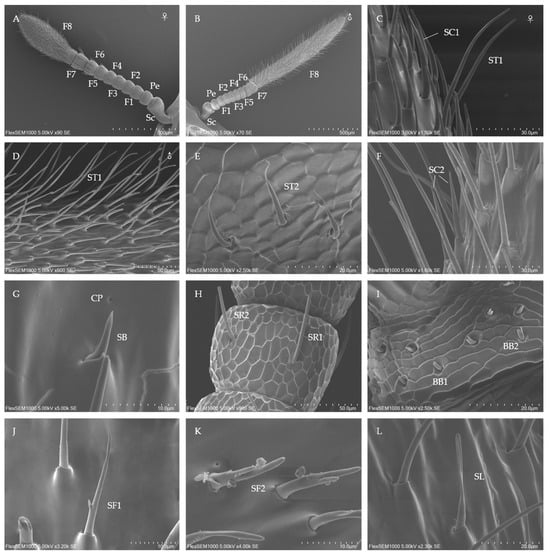 - Zhang, G.H.; Li, B.L.; Li, C.R. Morphology and distribution of antennal sensilla of female Phyllotreta striolata (Fabricius) (Coleoptera: Chrysomelidae). Microsc. Res. Tech. 2016, 79, 219–226. [Google Scholar] [CrossRef] [PubMed]