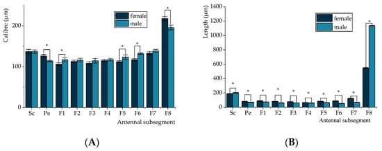 | Male | 128.33 ± 7.77 * | 4.89 ± 0.12 * | 8.00 ± 0.00 | Labrum, labium | |