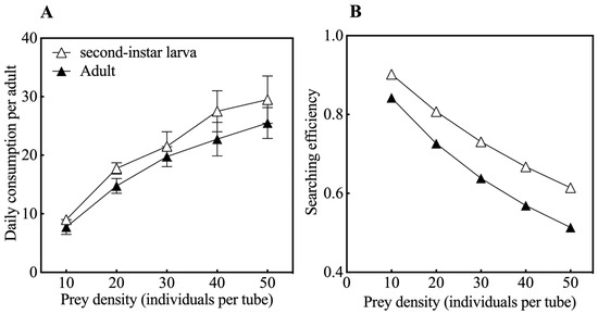 The predation function responses were fitted according to the Holling II disk equation (Holling 1959) [34]: Na = aTN/(1 + aThN). The formula for the searching efficiency of O. strigicollis on M. usitatus, S = a/(1 + aThN), was fitted [33,34,35]. In the formulas, N is the density of prey, Na is the number of predators at the corresponding density, a is the instantaneous attack rate, T is the total time of the experiment (1d in this experiment), and Th is the predator handling time for 1 prey (= T divided by the maximum predation rate).