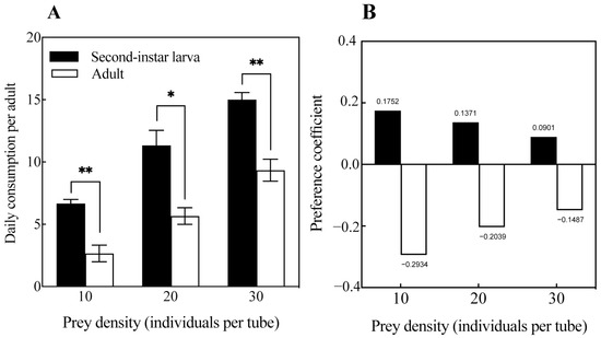 Daily consumption (A) and predation coefficient (B) of O. strigicollis on second-instar larvae and adults of M. usitatus. Note: * = p < 0.05, ** = p < 0.001.