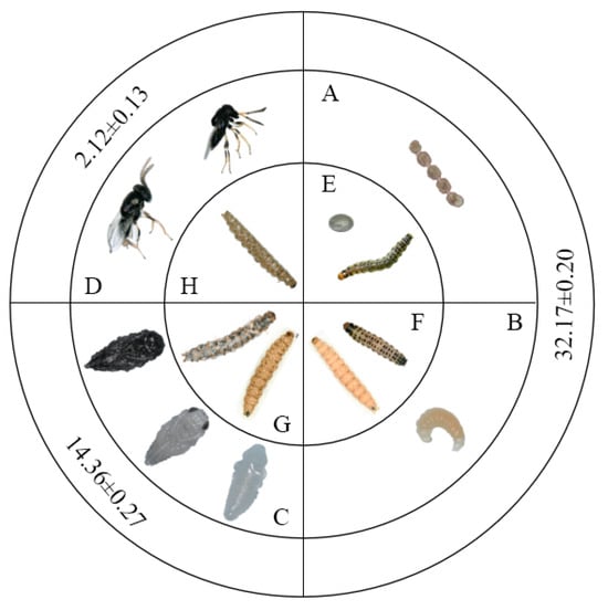 Life cycle of C. nacoleiae. (A): eggs; (B): larva; (C): pupae (early, middle, and late stages, shown clockwise, same as below); (D): adult; (E): an egg and a larva of the host; (F): intact and parasitized larvae of the host; (G): hosts at early and late stages of C. nacoleiae pupae; (H): host shell after emergence of C. nacoleiae. Data (mean ± SE) represent the duration of the stages of C. nacoleiae, measured in days.