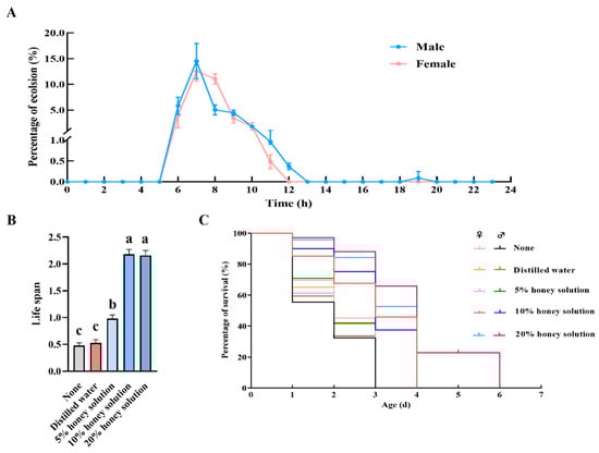 Life habits of C. nacoleiae adults. (A) Circadian rhythm of newly emerged adult C. nacoleiae. (B) Effects of nutritional supplementation on lifespan of adult C. nacoleiae (measured in days). (C) Survival curves of adult C. nacoleiae with different nutritional treatments. Different lowercase letters indicate significant differences between different nutritional supplementation (p < 0.05).