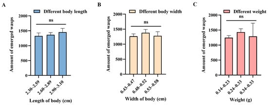 The number of emerging C. nacoleiae is related to the host’s body length, body width, and body weight. (A) Number of emerged wasps from mature larval hosts of different body lengths. (B) Number of emerged wasps from mature larval hosts of different body widths. (C) Number of emerged wasps from mature larval hosts of different weights. ns signifies no significance.