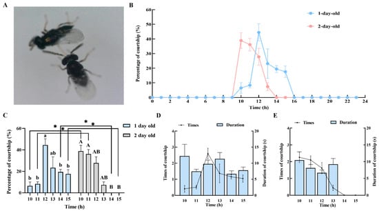 Courtship behavior and rhythms of male C. nacoleiae. (A) Male C. nacoleiae searching for female hosts. (B) Courtship rhythm of male C. nacoleiae of different ages. (C) Differential analysis of courtship percentages of male C. nacoleiae of different ages. * indicates that there are significant differences in males of different ages (p < 0.05). (D) Times and duration of courtship of 1-day-old male C. nacoleiae. (E) Times and duration of courtship of 2-day-old male C. nacoleiae. Different lowercase letters indicate significant differences between 1-day-old adults at different times. Different capital letters indicate significant differences between 2-day-old adults at different times (p < 0.05).