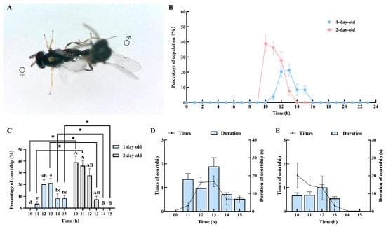 Mating behavior and rhythms of C. nacoleiae adults. (A) Copulation of adult C. nacoleiae. (B) Copulation rhythm of C. nacoleiae of different ages. (C) Results of differential analysis of copulation percentages of adult C. nacoleiae of different ages. * indicates that there are significant differences in adults of different ages (p < 0.05). (D) Times and duration of copulation of 1-day-old C. nacoleiae. (E) Times and duration of copulation of 2-day-old C. nacoleiae. Different lowercase letters indicate significant differences between 1-day-old adults at different times. Different capital letters indicate significant differences between 2-day-old adults at different times (p < 0.05).
