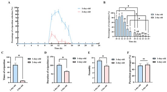 Oviposition behavior and rhythms of female C. nacoleiae. (A) Oviposition rhythm of C. nacoleiae of different ages. (B) Differential analysis of C. nacoleiae female oviposition rate at different ages. Different lowercase letters indicate significant differences between 1-day-old adults at different times. Different capital letters indicate significant differences between 2-day-old adults at different times (p < 0.05). (C) Times of oviposition of female C. nacoleiae of different ages. (D) Duration of oviposition of female C. nacoleiae of different ages. (E) Fecundity of female C. nacoleiae of different ages. (F) Parasitism percentages of female C. nacoleiae of different ages. * indicates that there are significant differences in females of different ages (p < 0.05). ns indicates that there is no significant difference in females of different ages.