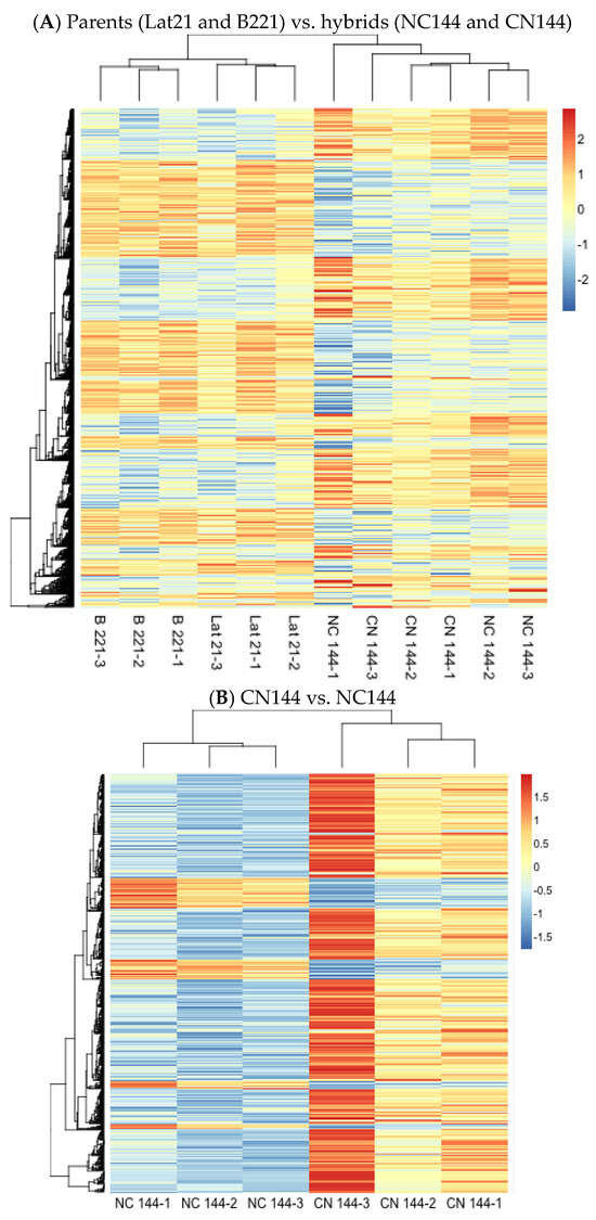 Differentially expressed genes were also visualized using heat maps to provide an overview of the changes in gene expression among the samples. Figure 1A shows two major clusters that can be observed based on gene expression: (1) for the two parental strains Lat21 and B221, and (2) for the two hybrid strains NC144 and CN144. Meanwhile, Figure 1B shows separate clusters for the NC144 and CN144 samples. There also seems to be a relatively equal distribution of upregulated and downregulated genes between the two clusters in Figure 1A, while Figure 1B shows that NC144 samples express more downregulated genes compared to CN144.