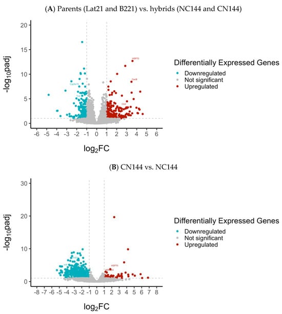 Changes in gene expression between different conditions were measured as fold change and were checked for significance using the Wald test []. Since the Wald test does not account for the multiple testing problem brought about by the numerous steps involved in RNA-seq analysis, the resulting p-values must be adjusted. This can be achieved by following the procedure of Benjamini and Hochberg [], which is already included in the DESeq2 package []. Genes whose adjusted p-values (padj) were less than 0.1 were considered differentially expressed. With this threshold, the number of differentially expressed genes (DEGs) identified was 1419 when comparing parents and hybrids and 959 when comparing CN144 and NC144.