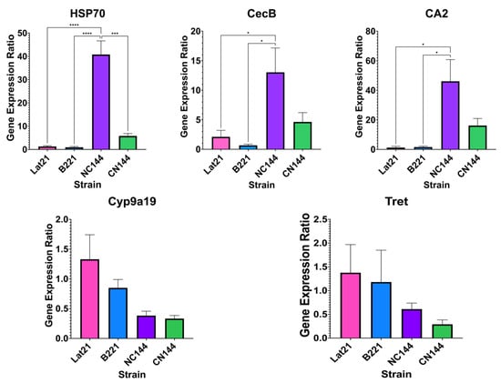 Figure 3 shows the relative expression of the DEGs in the parents vs. hybrids. Based on the results of the bioinformatics analysis, HSP70, CecB, and CA2 were expected to be upregulated in the hybrids, while Cyp9a19 and Tret were expected to be downregulated. It can be seen in Figure 4 that the expected changes in expression were followed for the gene expression ratios determined using qPCR, such that upregulated genes had higher gene expression ratios in the hybrids, NC144 and CN144, even when looking at them separately. This was also true for downregulated genes with lower gene expression ratios in each of the two hybrids. The statistical analysis indicates that most of the DEGs, particularly HSP70, CecB, and CA2, displayed significant differences only between the parental strains and NC144. This finding suggests that the higher expression levels of NC144 for these genes may mask their expression in CN144, resulting in an overall perception of increased expression when the hybrids are evaluated together. Future studies could improve the clarity of these results by performing differential expression analysis separately between each parent and hybrid. Additionally, the analysis did not reveal significant differences in the expression levels of Cyp9a19 and Tret across either the parental or hybrid strains, which aligns with the expectations based on their low log2 fold change values of −1.75 and −1.45, respectively, as suggested by the bioinformatics analysis.