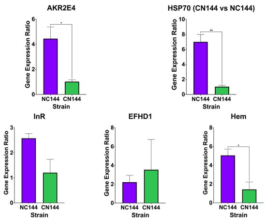 On the other hand, of the DEGs being validated in CN144 vs. NC144, HSP70 and AKR2E4 were expected to be upregulated in NC144 while InR, EFHD1, and Hem were expected to be downregulated. From these, only HSP70, AKR2E4, and EFHD1 followed the expected trend in gene expression, while InR and Hem appeared to be upregulated (Figure 4). Additionally, it was observed that only the expression levels of HSP70, AKR2E4, and Hem were significantly different between the two hybrids based on the unpaired T-test conducted. The algorithm used for mapping and the quantification of multimappers during bioinformatics analysis could have caused the observed deviation and the insignificant difference in relative expression from qPCR data []. With multimappers, the over- or underestimation of gene expression is possible due to the sharing of reads between active and inactive copies of a gene [].