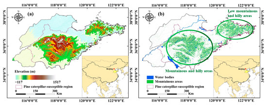 Shandong Province is located in the eastern coastal region of China, with geographical coordinates ranging from 34°22.9′ to 38°24.01′ N and 114°47.5′ to 122°42.3′ E (Figure 1a). The higher-elevation and mountainous areas are distributed in the central and eastern regions of Shandong Province (Figure 1b). Simultaneously, these regions are susceptible to pine caterpillar (Dendrolimus spp.) outbreaks, causing negative impacts on local forestry development and management [39]. The average annual temperature ranges from 11.2 to 14.4 °C.