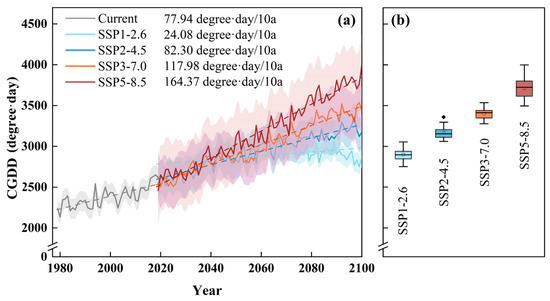 Temporal changes in the CGDD during the current period and future climatic scenarios. (a) The solid lines show the CGDD variations between 1979 and 2100, the dashed lines show linear trends of the CGDD, and the shaded areas show the 95% confidence interval. (b) The boxplot shows the CGDD values between 2081 and 2100. Note: /10a represents per decade. The rhomboid symbol represents outlier of the boxplot.