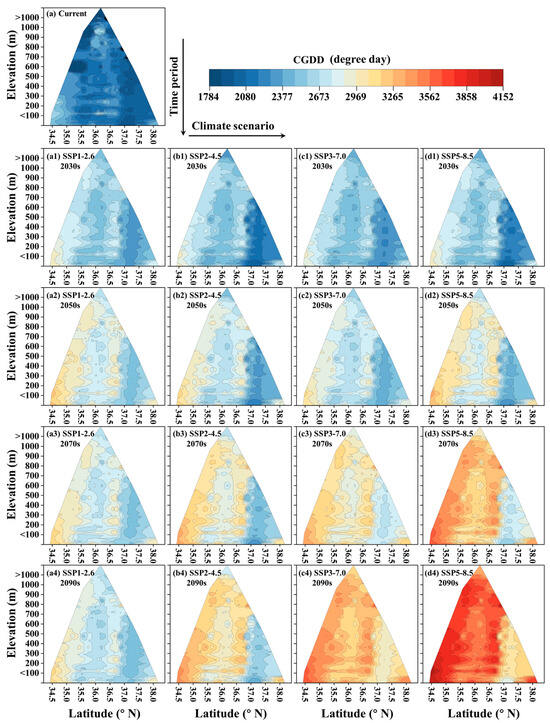 Elevational and latitudinal changes in CGDD under current period and future climatic scenarios. Time periods are displayed vertically and future climatic scenarios are displayed horizontally as follows: (a) current period and (a1–a4) SSP1-2.6, (b1–b4) SSP2-4.5, (c1–c4) SSP3-7.0, and (d1–d4) SSP5-8.5 scenarios. Color shifts from blue to red indicate a higher CGDD during each time period.