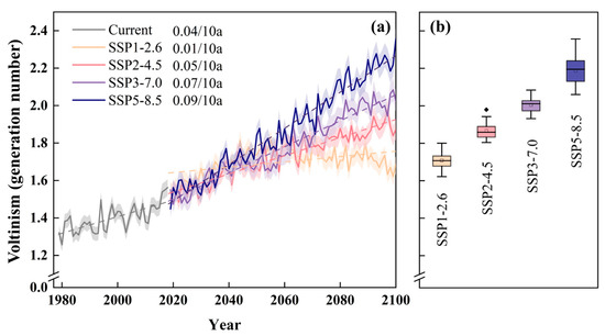Temporal changes in pine caterpillar voltinism under current period and future climatic scenarios. (a) The solid lines show the variations in pine caterpillar voltinism between 1979 and 2100, the dashed lines show linear trends of pine caterpillar voltinism, and the shaded areas show the 95% confidence interval. (b) The boxplot shows the value of pine caterpillar voltinism between 2081 and 2100. Note: /10a represents per decade. The rhomboid symbol represents outlier of the boxplot.
