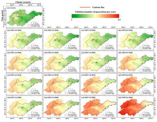 This study demonstrates that the cumulative growing degree day (CGDD) is projected to increase by 523.45, 790.91, 1026.55, and 1336.43 degree days by the end of this century under the SSP1-2.6, SSP2-4.5, SSP3-7.0, and SSP5-8.5 scenarios, respectively. This suggests an increase in pine caterpillar voltinism in a warming climate, with voltinism expected to rise from 1.40 ± 0.07 (current period) to 1.71 ± 0.04, 1.87 ± 0.04, 2.0 ± 0.04, and 2.19 ± 0.07 generations under the SSP1-2.6, SSP2-4.5, SSP3-7.0, and SSP5-8.5 scenarios, respectively. Model predictions indicate the greatest increase in the western plain, followed by the central and eastern regions of Shandong Province. From the perspective of elevation and latitude gradients, the lower-elevation (<1000 m) and lower-latitude (34–34.5° N) regions are expected to experience more generations in the future. The specific magnitude of these changes varies by time period and climate scenarios. Overall, pine caterpillar voltinism will increase with climate warming, with projections showing an increase of approximately 0.15, 0.2, and 0.28 generations per year for every 1 °C, 1.5 °C, and 2 °C rise in the average annual temperature, respectively.