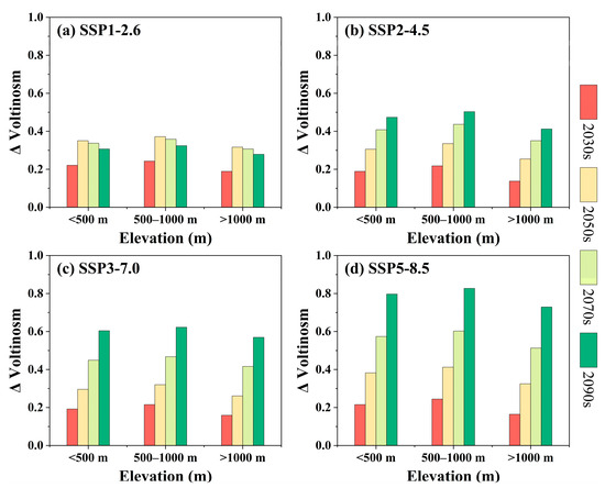 Elevational patterns of pine caterpillar voltinism under future climatic scenarios. (a) SSP1-2.6, (b) SSP2-4.5, (c) SSP3-7.0, and (d) SSP5-8.5 scenarios.