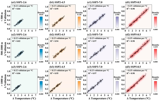 The relationship between pine caterpillar voltinism and temperature along elevational gradients under future climatic scenarios. The y-axis is the change extent in voltinism and the x-axis is the change extent in average annual temperature. Scatter plots show the value of pine caterpillar voltinism, and solid lines show the fitting line of pine caterpillar voltinism (n = 82). (a1–a3) SSP1-2.6, (b1–b3) SSP2-4.5, (c1–c3) SSP3-7.0, and (d1–d3) SSP5-8.5 scenarios.