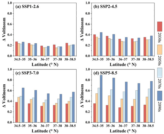 Latitudinal changes pattern in pine caterpillar voltinism under future climatic scenarios. (a) SSP1-2.6, (b) SSP2-4.5, (c) SSP3-7.0, and (d) SSP5-8.5 scenarios.