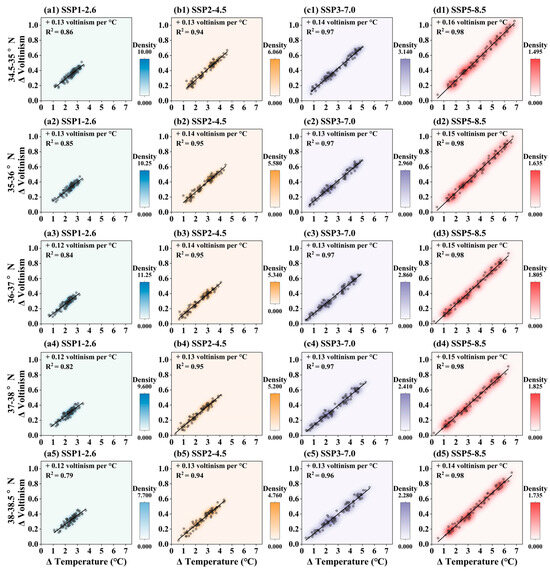Relationship between pine caterpillar voltinism and temperature along latitudinal gradients under future climatic scenarios. The y-axis is the change extent in voltinism and the x-axis is the change extent in average annual temperature. Scatter plots show the value of pine caterpillar voltinism, and solid lines show the fitting line of pine caterpillar voltinism (n = 82). (a1–a5) SSP1-2.6, (b1–b5) SSP2-4.5, (c1–c5) SSP3-7.0, and (d1–d5) SSP5-8.5 scenarios.
