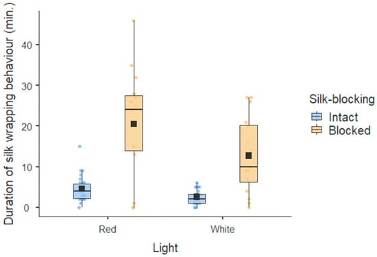 When presented with a prey gift item, 82 of 89 males (92%) seized it. Out of the males who took the gift, 29/30 (97%) and 25/28 (89%) of the silk-intact males under red and white conditions wrapped it, respectively. As expected, because of the treatment, none of the silk-blocked males under red (0/15) or white light (0/16) conditions successfully wrapped their prey with silk. However, most of them exhibited wrapping behaviour by attempting to wrap the prey, indicating that the behaviour was performed even in the absence of silk production. Wrapping the prey was only significantly affected by silk-blocking (Table 1) because silk-blocked males were unable to wrap the prey with silk. We measured the time males invested in performing the same gift-wrapping movements as silk-intact males. Neither light conditions, the interaction term, nor the male or female condition was found to influence the likelihood of wrapping the gifts by males (Table 1). The latency time to wrap the prey was shorter under white light than under red light, but the effects of silk-blocking and male and female body condition were not significant (Table 1). However, the interaction between light conditions and silk-blocking significantly influenced the latency time until wrapping the prey (Table 1). Silk-intact spiders showed no differences in latency time between lighting conditions (red, mean = 9.93 ± 11.1 min, N = 28, white, mean = 9.28 ± 6.46 min, N = 22). Silk-blocked males under red lights started, however, to wrap gifts sooner than under white lights (red, mean = 7.64 ± 6.25 min, N = 14; white, mean = 12.3 ± 12.8 min, N = 14) (Table 1).