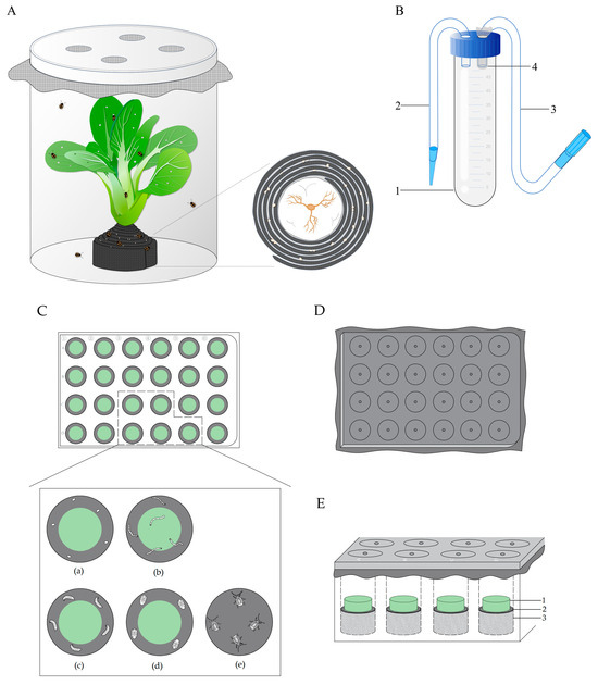 A schematic diagram of the rearing device for Phyllotreta striolata. (A) The device for adult rearing and oviposition. (B) The suction trap device for adult collection: 1. insect storage tube; 2. entrance conduit; 3. negative pressure conduit; 4. 400-mesh gauze. (C) Top view of the rearing device without lid; (a) egg, (b) larva, (c) prepupa, (d) pupa, (e) adult. (D) Top view of the rearing device lid. (E) Side view of the rearing device with lid: 1. round slice of radish root; 2. round black cotton cloth; 3. agar substrate.