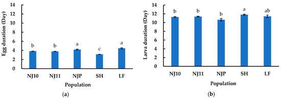 Egg duration was significantly influenced by different populations (F4, 3115 = 107.120, p < 0.001). The SH population (mean ± SE, 3.13 ± 0.03 days, n = 1181) exhibited a significantly shorter egg duration than LF (4.47 ± 0.13 days, n = 74) (z = 11.765, p < 0.001) (Figure 3a). There was no significant difference in egg duration between NJ10 (3.82 ± 0.04 days, n = 831) and NJ11 (3.78 ± 0.03 days, n = 918) (z = 0.663, p = 0.964), nor between NJP (4.19 ± 0.10 days, n = 116) and LF (z = 1.734, p = 0.413) (Figure 3a).