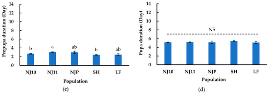 The pupa rate was not significantly influenced by the different populations (F4, 44 = 1.390, p = 0.253) (Figure 4c). The pupa rates (mean ± SE) of NJ10, NJ11, NJP, SH, and LF were 71.90% ± 5.02% (n = 20), 67.71% ± 4.23% (n = 10), 61.90% ± 17.14% (n = 6), 55.50% ± 5.82% (n = 9), and 54.55% ± 14.02% (n = 4), respectively (Figure 4c).
