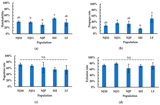 The survival rates of Phyllotreta striolata across four developmental stages in five F1 populations. (a) Egg hatchabilities in five populations; (b) prepupa rates of larvae in five populations; (c) pupation rates in five populations; (d) eclosion rates in five populations. The bars indicate standard errors. The same letters at the top of the columns indicate no significant difference in the parameter between them (p > 0.05). NS above the dotted line indicates no significant difference in the parameter between all populations (p > 0.05).