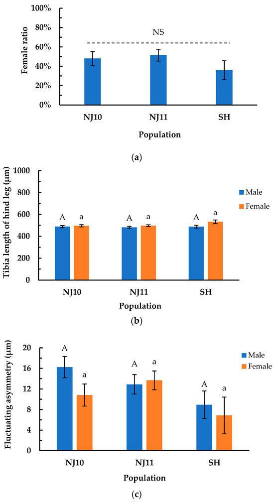 The female ratio, length of the hind tibia, and fluctuating asymmetry of P. striolata from NJ10, NJ11, and SH populations were obtained through laboratory rearing and measuring. The female ratio was not significantly influenced by the different populations (F2, 142 = 0.870, p = 0.420) (Figure 5a). The female ratios (mean ± SE) of NJ10, NJ11, and SH populations were 48.08% ± 7.00% (n = 52), 51.47% ± 6.12% (n = 68), and 36.00% ± 9.70% (n = 25), respectively.