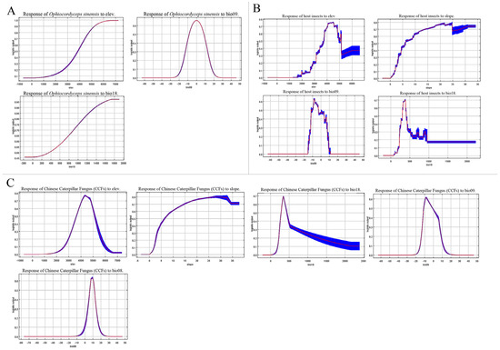 Single response curves of dominant environmental factors of the O. sinensis (A), host insects (B), and CCFs (C).