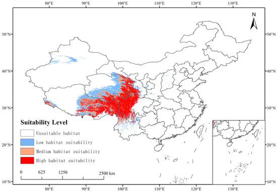 The area highly suitable for CCFs was 64.06 × 104 km2, the area moderately suitable was 29.28 × 104 km2, the area with low suitability was 52.39 × 104 km2, and the unsuitable habitat area was 815.35 × 104 km2. The highly suitable habitat accounted for 6.67% of the total national area, while the moderately suitable habitat accounted for 3.05% (Table S7). The highly suitable habitat was primarily found in the southeastern part of the Qinghai–Tibet Plateau, the Qilian Mountains, and the Hengduan Mountains, ranging from 25° N to 39° N and 87° E to 105° E (Figure 5).