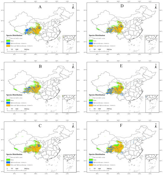 Potential distribution of areas where O. sinensis and host insects can coexist based on different future climate scenarios. (A) 2050s-SSP1-2.6; (B) 2050s-SSP3-7.0; (C) 2050s-SSP5-8.5; (D) 2070s-SSP1-2.6; (E) 2070s-SSP3-7.0; (F) 2070s-SSP5-8.5.