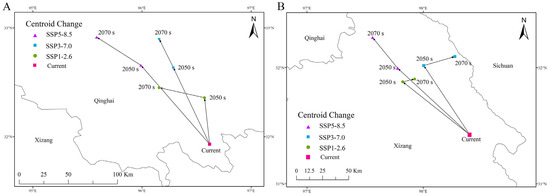 Currently, the distribution center of the CCF’s suitable habitat is located in Chamdo City, Tibet Autonomous Region (98°24′4″ E, 31°25′14″ N) (Figure 8B). By the 2090s, according to the SSP1-2.6, SSP2-4.5, SSP3-7.0, and SSP5-8.5 scenarios, the distribution center is projected to shift to 97°55′38″ E 31°54′9″ N, 98°17′14″ E 31°56′52″ N, and 97°33′56″ E 32°15′37″ N, respectively. Overall, the movement range of the CCF’s centroid is minimal, with the suitable habitat shifting in the northwest direction. In summary, the centroids of the suitable habitats for both species move in the same direction, shifting towards the northwest and higher latitudes over time.