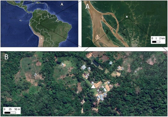 Sample collection area. (A) Satellite view of the Anopheles collection site in the Amazon basin, Colombia, near the border with the Peruvian and Brazilian Amazon rainforest. (B) Indigenous community of S.P.L. and its surrounding area within the Yahuarcaca watershed.