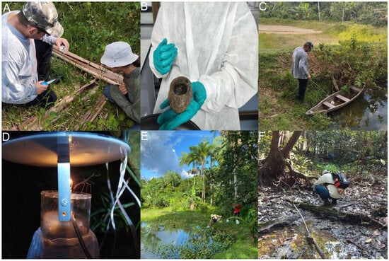 Active search for potential Anopheles breeding sites in the Yahuarcaca watershed at S.P.L. locality and installation of light traps. (A) Palm tree bracts that store rainwater. (B) Seed husk, described by the community as a potential breeding site. (C) Abandoned canoe in a fishing pond, flooded by rainwater, without fish inside the pond. (D) Collection using CDC light traps before dawn, ensuring 10 h of activity during the night. (E) Fishing pond. (F) Puddles adjacent to the Yahuarcaca stream.