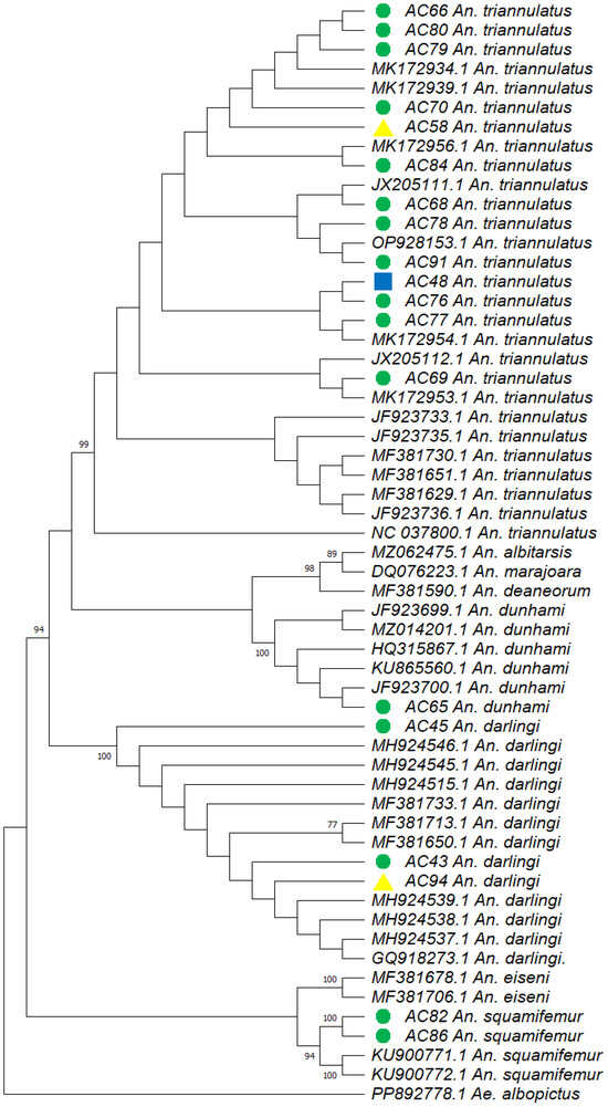 Regarding An. dunhami, our preliminary classification based on classical taxonomy placed it under An. nuneztovari, as it was initially considered synonymous with this species, and later with An. trinkae, both recognized malaria vectors []. Although An. dunhami is currently regarded as a non-vector species, as it is not involved in the parasite transmission cycle, its relevance is highlighted by its morphological similarities to other vector species of the Oswaldoi Group [].