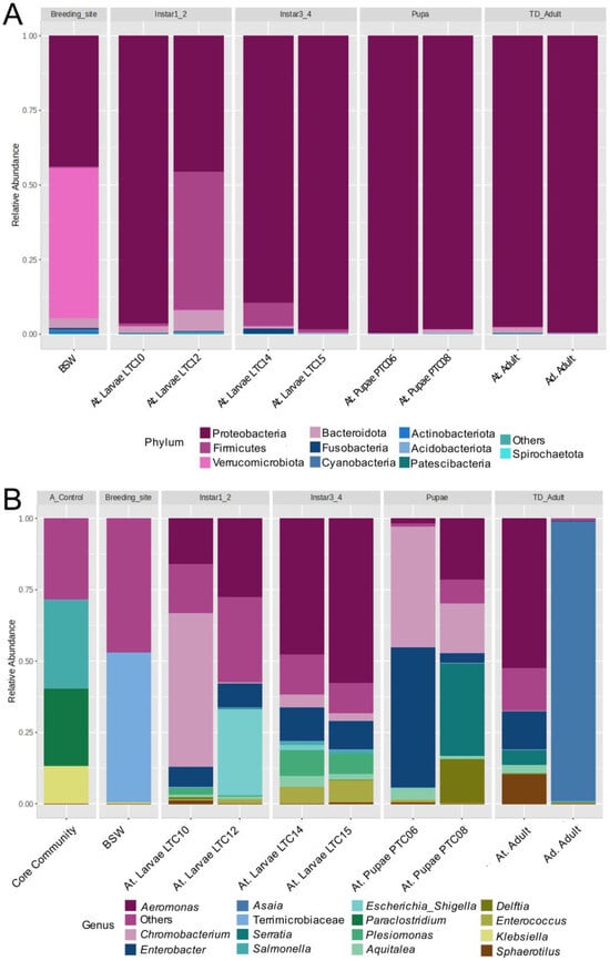 Stacked bar chart of the relative abundance profiling of phyla (A) and genera (B) found in An. triannulatus s.l., its breeding site, and An. darlingi. Samples of mosquitoes are grouped by life stage. All samples were collected in the fishing pond, except for the An. darlingi pool of adults that were collected from the peridomestic area of S.P.L.-Leticia, Amazonas. The Core Community sample was used as a control. Core Community: Control sample; BSW: Breeding site water; At. Larvae: An. triannulatus s.l. larvae samples; At. Pupae: An. triannulatus s.l. pupae samples; At. Adult: An. triannulatus s.l. adult sample; Ad. Adult: An. darlingi adult sample.