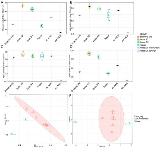 Box-and-whiskers plot representing α-diversity and differences in community structures of immature and adult stages of An. triannulatus s.l., adults of An. darlingi from the peridomestic area of S.P.L., and An. triannulatus s.l. breeding site in terms of (A) observed richness (p-value 0.017, T-test statistic: 3.5182); (B) Shannon index (p-value: 0.28, T-test statistic: 1.9405); (C) Simpson index (p-value 0.42, T-test statistic: 1.2518); (D) Chao1 index (p-value 0.017, T-test statistic: 3.5182); (E) PCoA (F-value: 2.3931; R-squared: 0.25477; p-value: 0.03); and (F) NMDS (F-value: 2.3931; R-squared: 0.25477; p-value: 0.028; stress: 0.018854).