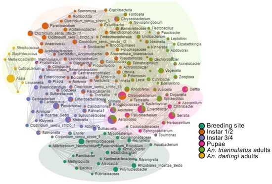 Correlation network using Pearson’s correlation coefficient (r) and log-transformed abundances of microbial groups in the different anopheline samples and their breeding site. The green circle represents the cluster associated with bacteria from the water sample. The yellow circle represents the cluster of bacteria from An. darlingi adults. Clusters with no circles represent bacteria of immature and adult stages of An. triannulatus s.l.