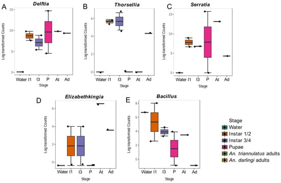 Log-transformed abundances of Delftia (A), Thorsellia (B), Serratia (C), Elizabethkingia (D), and Bacillus (E). Water: sample from the breeding site. I1: larvae of An. triannulatus s.l. in the first and second instar. I3: larvae of An. triannulatus s.l. in the third and fourth instar. P: pupae of An. triannulatus s.l. At: adults of An. triannulatus s.l. Ad: adults of An. darlingi.