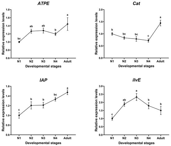 The relative mRNA abundance of ilvE, ATPE, Cat, and IAP genes in each developmental stage of aphids was examined using RT-qPCR (Figure 1). The four target genes were expressed in all developmental stages of aphids, and the expression profile of each gene was different. The highest expression of ATPE (F4,10 = 11.86, p < 0.001), Cat (F4,10 = 35.72, p < 0.001), and IAP (F4,10 = 26.41, p < 0.001) was found in the adult stage. There was no significant difference in the expression of ATPE among nymphal instars, whereas the expression of Cat declined with the development of nymphal stages, and that of IAP showed an increasing trend with the development of aphids. The expression of ilvE was significantly higher in the third instar than in the other instars (F4,10 = 20.82, p < 0.001), and there was no significant difference in the expression of the other developmental stages.