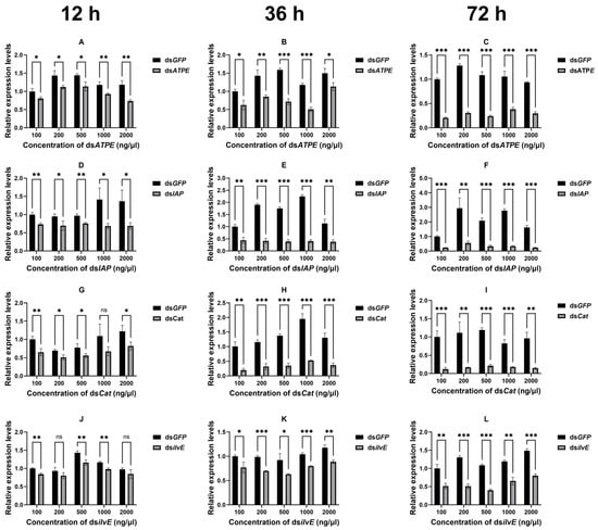 Silencing efficiency of four target genes of the aphid after 12 h (A,D,G,J), 36 h (B,E,H,K), and 72 h (C,F,I,L) of topical delivery of dsRNA at different concentrations. Data are means ± standard error. Data were analyzed by Student’s t-test. * p < 0.05, ** p < 0.01, *** p < 0.001, ns indicates no significant difference.