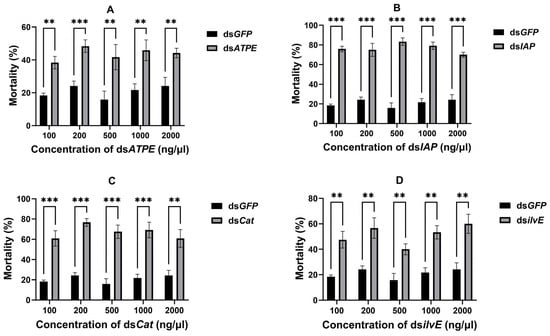 Aphid mortality after topical delivery of different concentrations of dsRNA for 72 h. (A) dsATPE, (B) dsIAP, (C) dsCat, and (D) dsilvE. Data are means ± standard error. Data were analyzed by Student’s t-test. ** p < 0.01, *** p < 0.001.