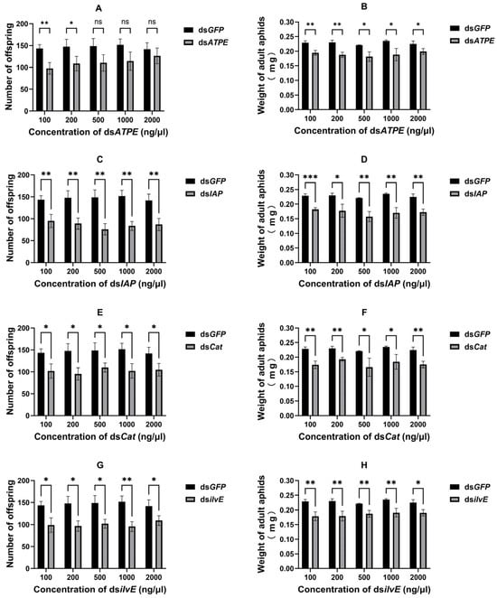 Effect of topical delivery of dsRNA on aphid fecundity [(A) dsATPE, (C) dsIAP, (E) dsCat, and (G) dsilvE] and body weight [(B) dsATPE, (D) dsIAP, (F) dsCat, and (H) dsilvE]. Data are means ± standard error. Data were analyzed by Student’s t-test. * p < 0.05, ** p < 0.01, *** p < 0.001, ns indicates no significant difference.