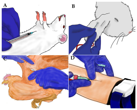 Blood collection of samples from the different sources. (A) blood collection via cardiac puncture in mice; (B) blood collection via venous puncture in rabbits, in (C) chickens and in (D) humans.