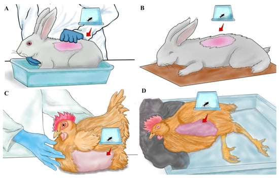 Blood feeding on rabbits and chickens. Mosquito cages were positioned over the shaved area of the animals to allow for blood feeding. (A) A non-anesthetized rabbit was physically restrained during the procedure. (B) An anesthetized rabbit was placed on wood paper, enduring a proper position to avoid the obstruction of the animal’s airways. (C) For the blood meal on the chicken, feathers were removed from the chest area before positing the mosquito cages. (D) A piece of felt fabric was used to maintain the head of the anesthetized chicken at a medium-high position, which is essential for preserving the normal breathing and blood circulation of the animal.